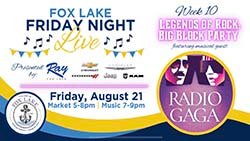 Aug 21 Fox Lake Friday Night Summer Concert Series 2026 – Legends of Rock: Big Block Party 7:00 pm - 9:00 pm Fox Lake Lakefront Park 10 Riverview Avenue, Fox Lake Concert Details Get Directions
